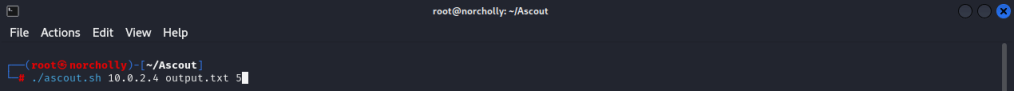 Now that our script is executable, let’s write the IP Address of the target system and an argument output.txt to save the outputs, and the speed option then let’s launch our script. ./ascout.sh <ip_address> <output_file> <Speed Range 1-5 (1 slowest, 5 fastest)