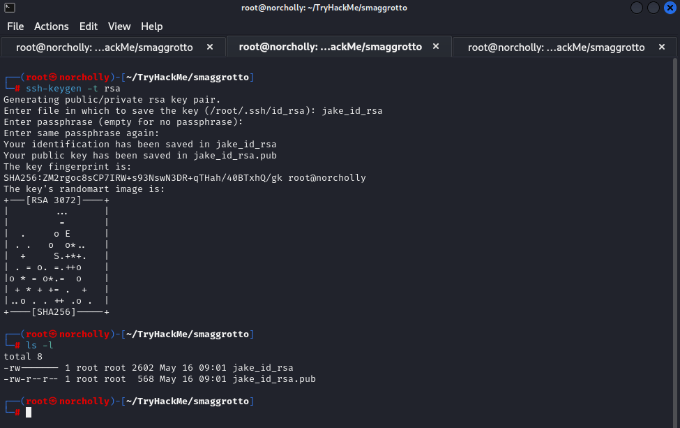 When we execute cat /etc/crontab we see an id_rsa file. In order to log in as the Jake user, we need to replace this id_rsa file with one we have created. After switching to the terminal on our own machine, let’s create an SSH key and name it “jake_id_rsa”.