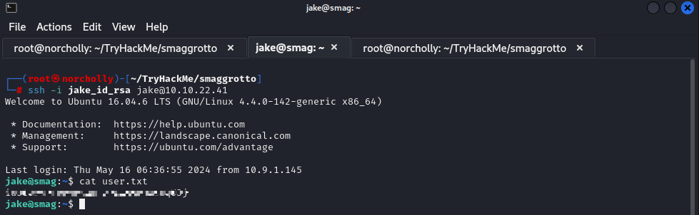 Everything is ready for us to become the Jake user. We can log in as the Jake user by typing ssh -i jake_id_rsa jake@<target_ip_address>
