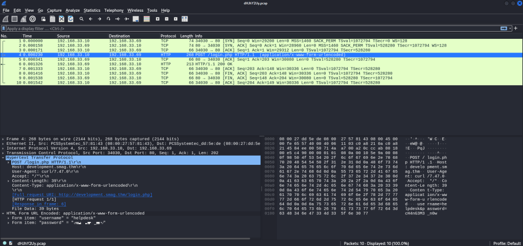 We see an HTTP login POST method, and upon inspection, we encounter login credentials and a subdomain named development.smag.thm, with the parent domain being smag.thm.