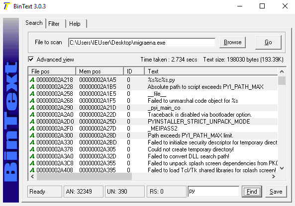 When I search for “py,” we see the text PYINSTALLER. This confirms that the malware was written in Python and converted to .exe format using PyInstaller.