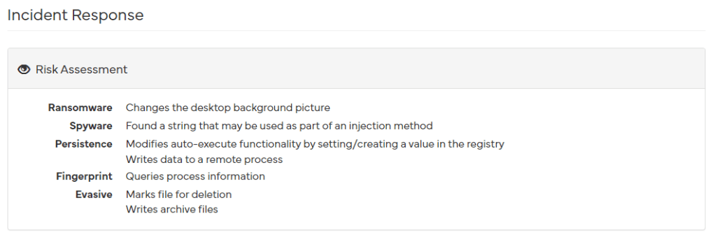 As you can see, the scan results tell us exactly what our code does. It mentions changing the desktop wallpaper, gaining persistence by adding itself to the registry, deleting files, and so on.
