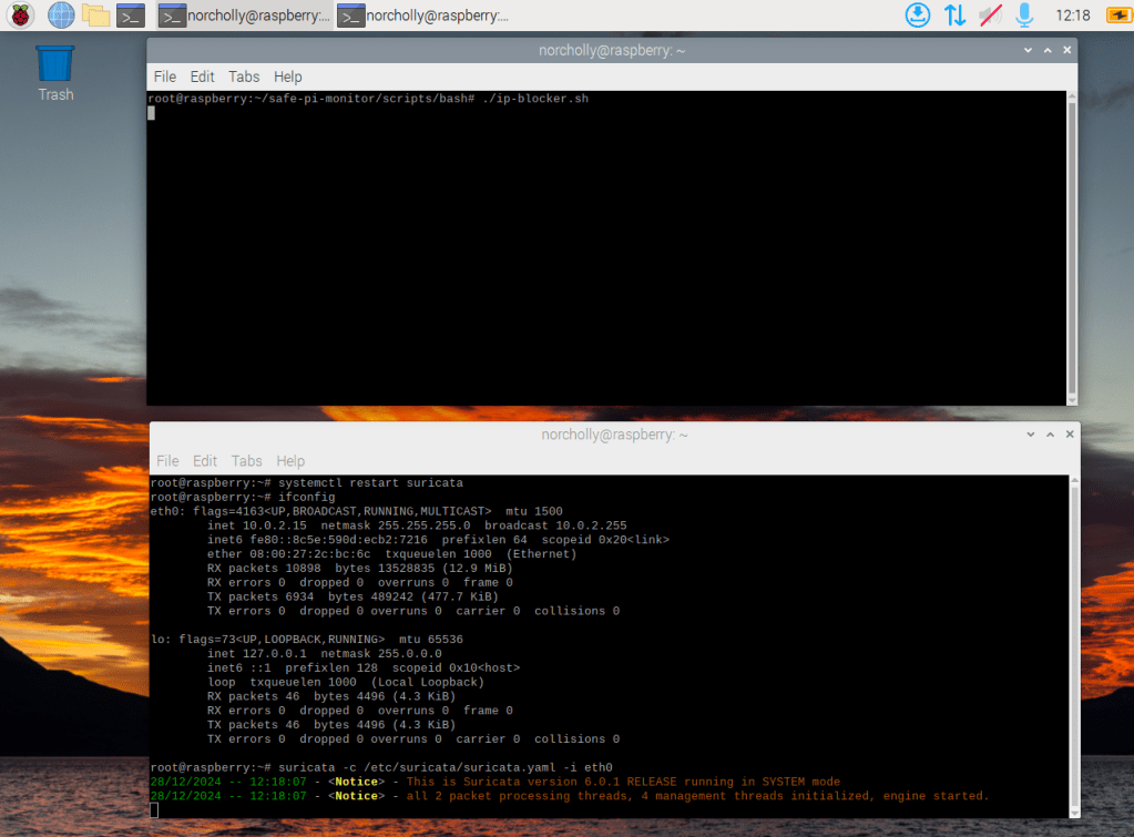 systemctl restart suricata komutu ile IDS sistemini yeniden başlatıyoruz. Tekrardan cd /root/safe-pi-monitor/scripts/bash komutunu yazarak bash scriptlerimizin olduğu dizine geliyoruz ve nano ip-blocker.sh ile ip-blocker scriptimizin içine kendi local IP adresimizi yazıyoruz.