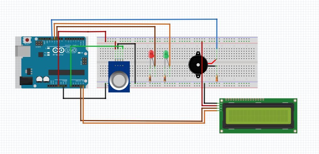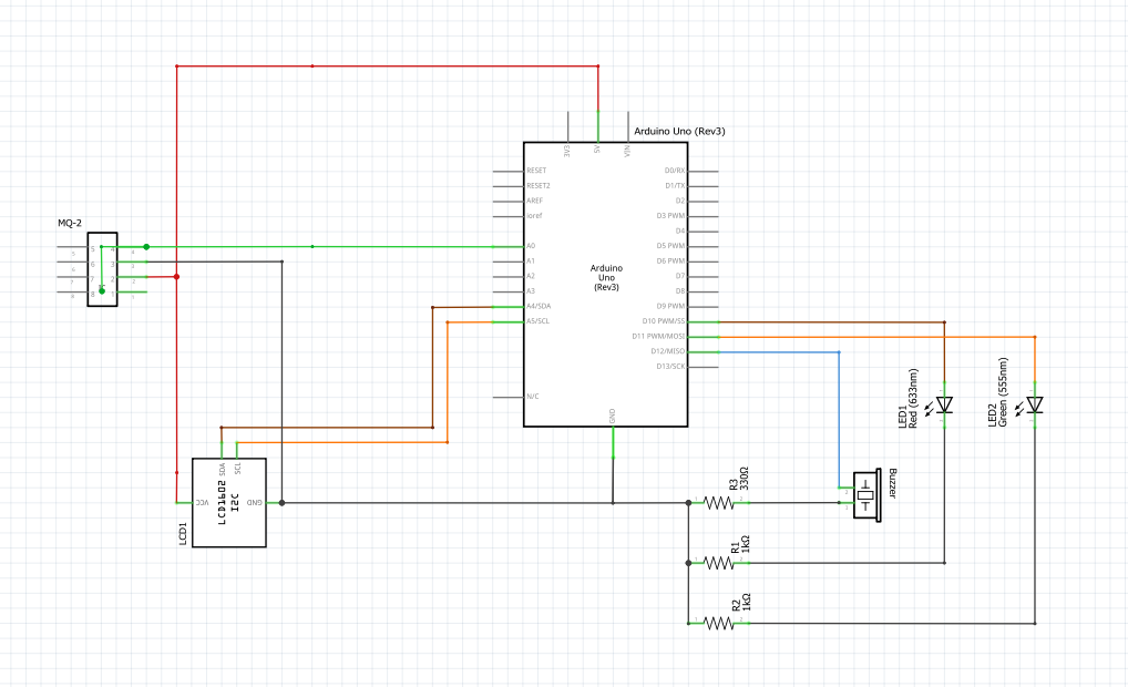 The MQ-2 sensor is connected to the analog input of the Arduino, while LEDs and the buzzer are connected to digital pins. The LCD screen communicates using the I2C interface to minimize the number of required connections.