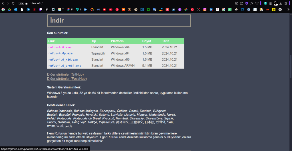 Bu .iso dosyasını Ubuntu olarak kullanacağımız USB belleğe kurulum yapmak için kullanacağımız diğer, sadece kurulum işlemi yapmakla yükümlü USB belleğe kurmak üzere rufus programını https://rufus.ie/tr/ sitesinden indirelim.