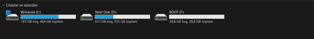F diski sadece kurulum işlemi için gerekli olacak. E diski ise taşınabilir linux/ubuntu işletim sistemimiz olacak.
