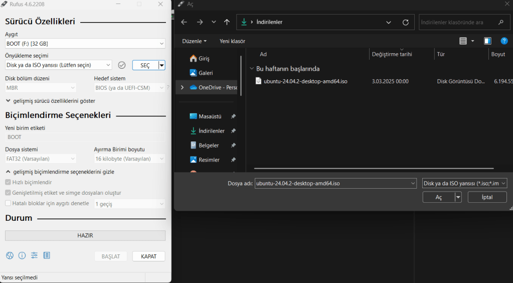 NOT: Bir USB belleği sadece kurulumu yapabilmek için kullanacağız. Diğer USB bellek ise taşınabilir kalıcı linux/ubuntu işletim sistemimiz olacak.