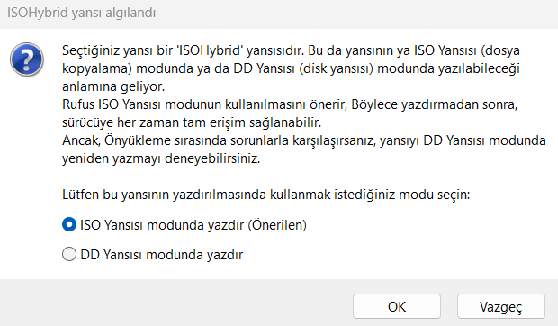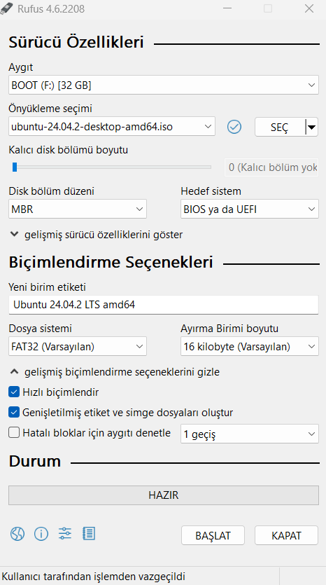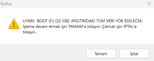 Artık kurulum işlemi amacıyla kullanacağımız USB bellek hazır.