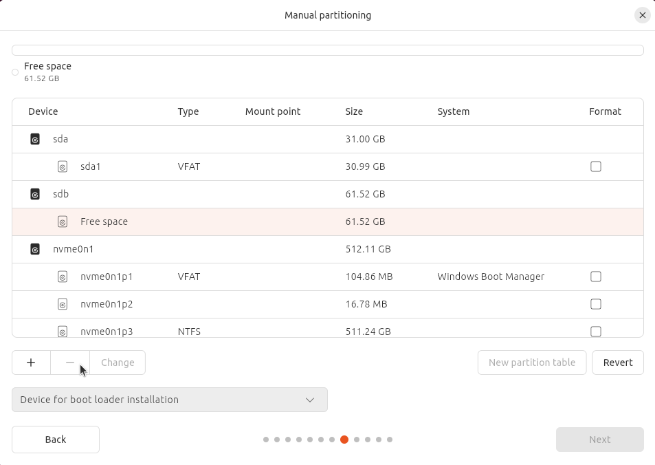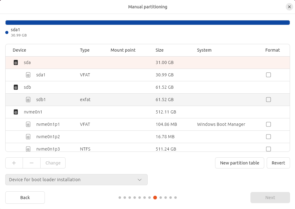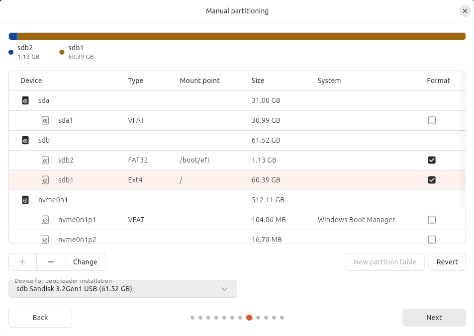 Linux/Ubuntu işletim sistemini kuracağımız disk (bende sdb ancak sizde sda olabilir) bu şekilde seçili olmalı: (Eğer rufus ile işletim sistemi kurmaya yardımcı olan USB belleğimizi seçersek kurulum esnasında sorun çıkacaktır.)